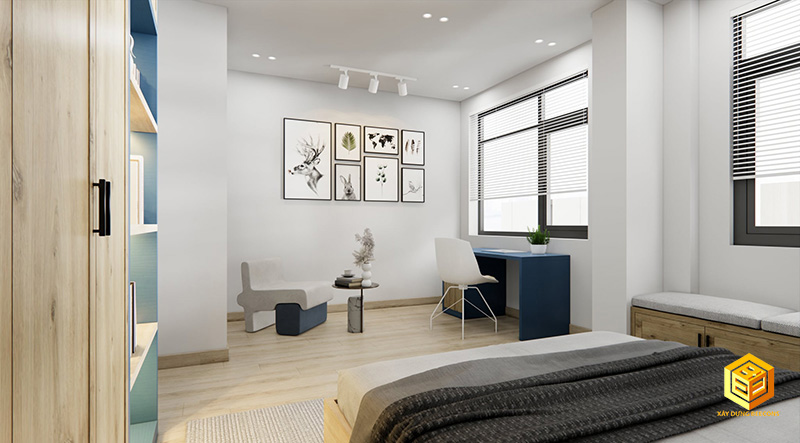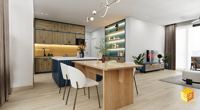 Căn hộ thiết kế với hai tông màu trắng, gỗ làm chủ đạo. Nhấn nhá thêm sắc xanh tạo điểm nhấn cho không gian thêm sang trọng nhưng vẫn nhẹ nhàng, gần gũi.Phòng khách cá tính với bộ ghế sofa trắng – nâu tạo cảm giác thoải mái và dễ chịu khi sử dụng. Kết hợp với 2 chiếc bàn trà hình dáng độc đáo càng làm tôn lên vẻ đẹp sang trọng, tinh tế của căn phòng.Nội thất được bài trí ngăn nắp, chỉnh chuThiết kế căn hộ mang vẻ đẹp hiện đại, trẻ trung với kiểu dáng nhẹ nhàng, tinh tế căn hộ mang vẻ đẹp cuốn hút biết bao ánh nhìn. Chính vì đó nên đã nhận được rất nhiều yêu thích từ phía khách hàng.Tổng thể căn hộ tươi sáng, nổi bật nhưng vẫn không kém phần tinh tếPhòng bếp thiết kế dạng chữ I kết hợp với bếp đảo và bàn ăn lớn tạo một không gian bếp đầy đủ tiện nghi.Phòng khách với không gian mở liền kề với bếp giúp cho sinh hoạt của gia đình thuận tiện hơn, cũng giúp cho khống gian gần gũi và ấm áp.Tủ bếp cũng được thiết kế cùng tone màu với thiết kế của căn nhàKhông gian phòng ngủ tràn đầy sức sống đầy đủ tiện nghi. Để gia chủ có những giây phút thư giãn thì công dụng của chiếc giường ngủ êm ái, ánh đèn dịu nhẹ không thể thiếu.Thiết kế nội thất hiện đại mang nét đẹp trẻ trung, khỏe khoắn tích hợp tối đa công năng sử dụng.Tủ áo quần bố trí âm tường cao, rộng đầy đủ các ngăn ,tiện dụng cho quá trình lưu trữ.Không gian nghỉ ngơi được bố trí khoa học cùng bảng màu trung tính mang đến sự tươi mới, mát mẻ cho cả căn phòng.Thiết kế Window Bay tại cửa sổ mang đến một góc thư giãn “cực chill” cho chủ nhân căn phòngKhông gian làm việc được thế kế cạnh cửa sổ giúp đón ánh sáng và gió tự nhiên, mang đến sự thoải mái, minh mẫn và năng lượng dồi dào hơn cho gia chủ khi làm việcPhương án bố trí bàn làm việc trong phòng ngủ thường được ứng dụng trong những căn hộ có diện tích vừa và nhỏ, không có không gian dành riêng cho một phòng làm việc độc lập.Mặt bằng tổng thể căn hộ 2 phòng ngủMặt bẳng tổng thế căn hộ 2 phòng ngủ