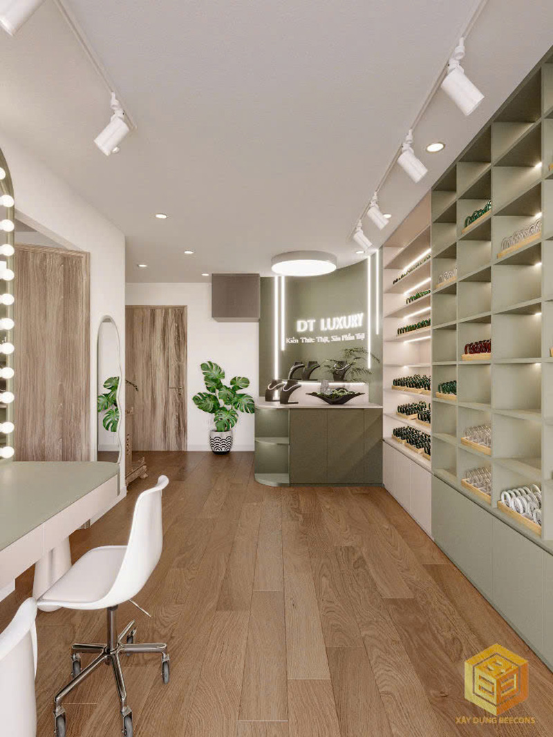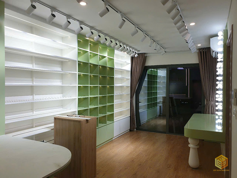 - Khu vực tủ trưng bày: Kệ tủ với các ngăn rộng rãi, màu sắc hiện đại, phù hợp để sắp xếp sản phẩm gọn gàng và thu hút.