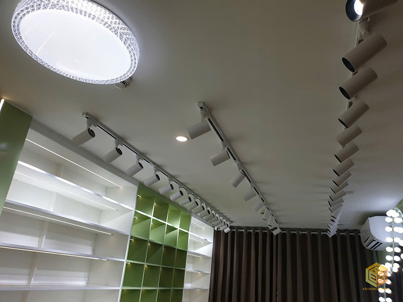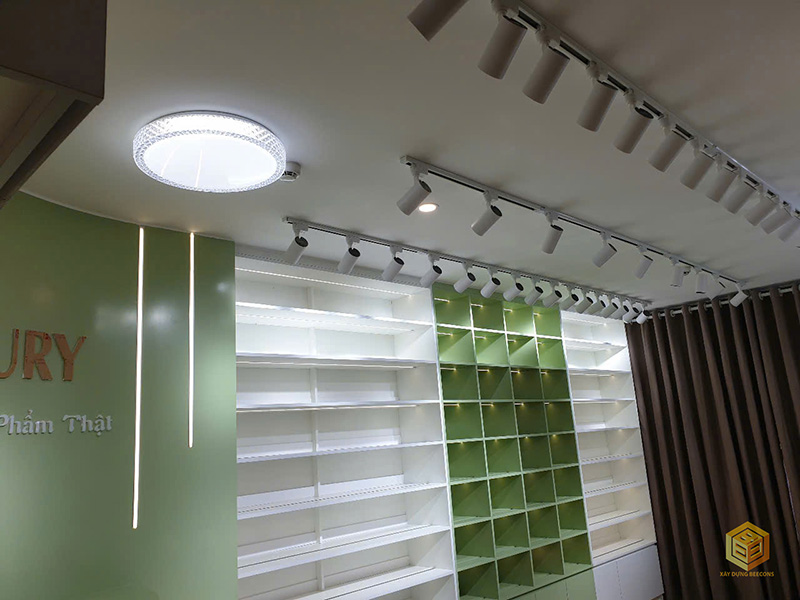 - Đèn chiếu rọi gắn trần, bố trí đều để làm nổi bật sản phẩm trưng bày và không gian.